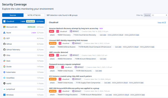 • Regras de segurança pré-configuradas, alinhadas a frameworks reconhecidos como o MITRE ATT&CK.