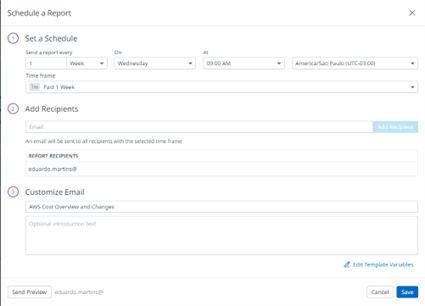 • Relatórios: Permite que relatórios agendados possam ser configurados para serem enviados regularmente por e-mail. Os relatórios fornecem informações detalhadas sobre os gastos na nuvem, permitindo que você acompanhe o uso de recursos e tome decisões informadas.