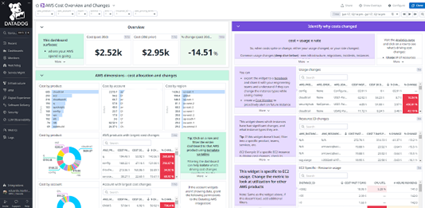 Além disso, o Datadog Cloud Costs Management oferece uma visualização chamada Cost Overview and Changes. Essa funcionalidade permite identificar de forma facilitada todas as alterações feitas na infraestrutura que geraram algum custo, seja para mais ou para menos. É uma maneira eficaz de acompanhar e entender como as mudanças impactam os gastos na nuvem.